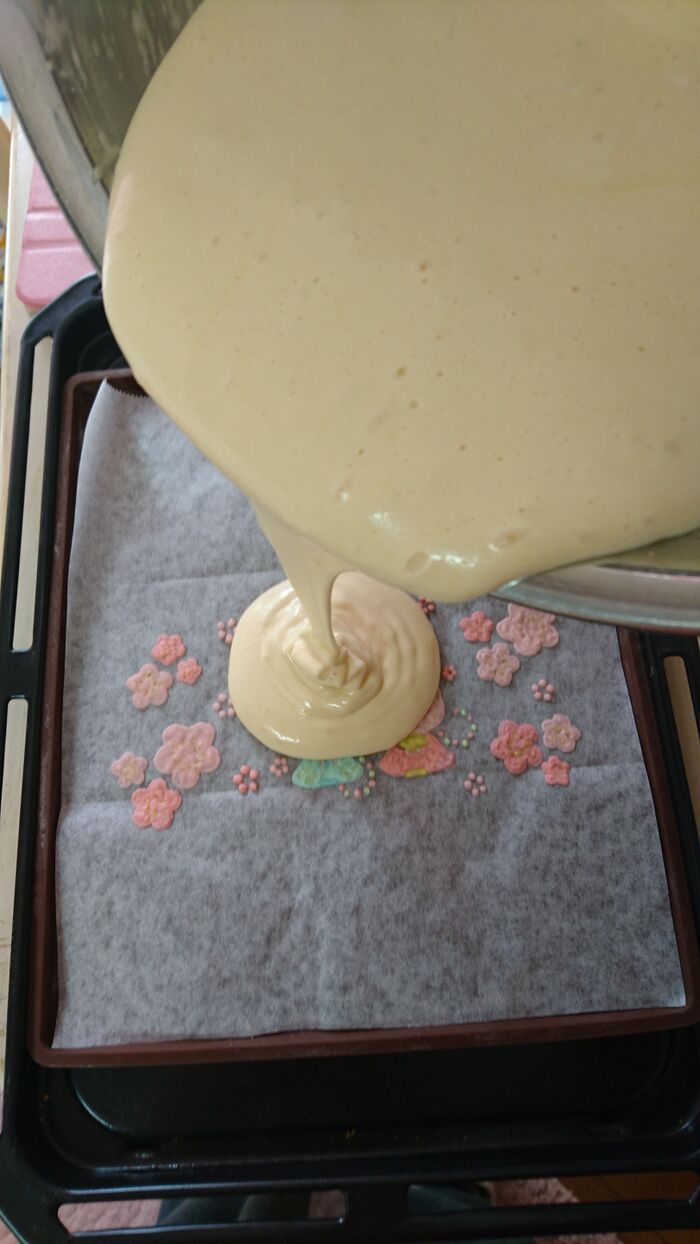 ロールケーキの生地が出来上がったら、冷凍庫からシートを出して型にはめます。