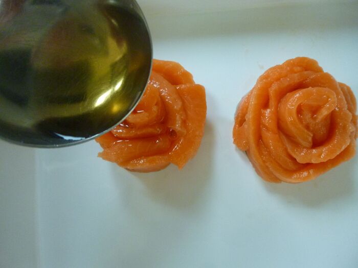 ③薔薇の形に調えたら、白だしをかけて味を染みらせておく。
