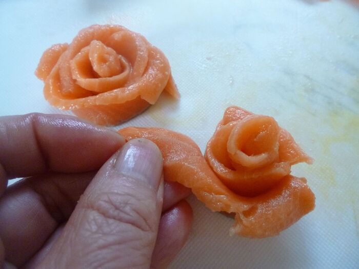 ペットボトルから外した3色の梅の酢飯の上に用意しておいた薔薇のサーモンをのせる。
