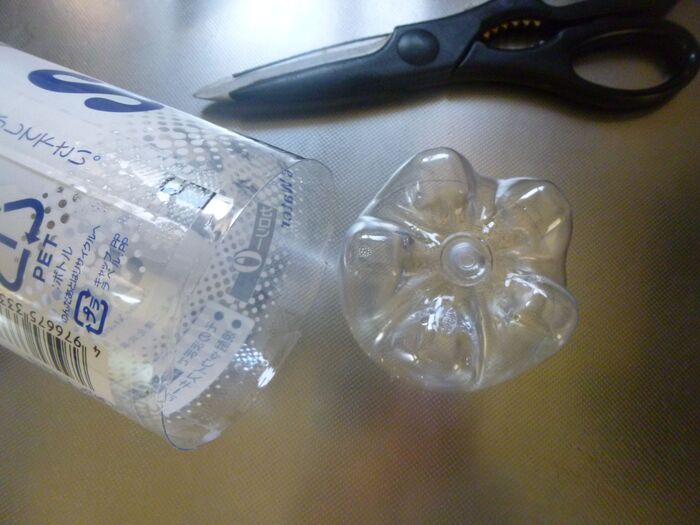 ①ペットボトルは底の部分に線があるのでその部分を切る。