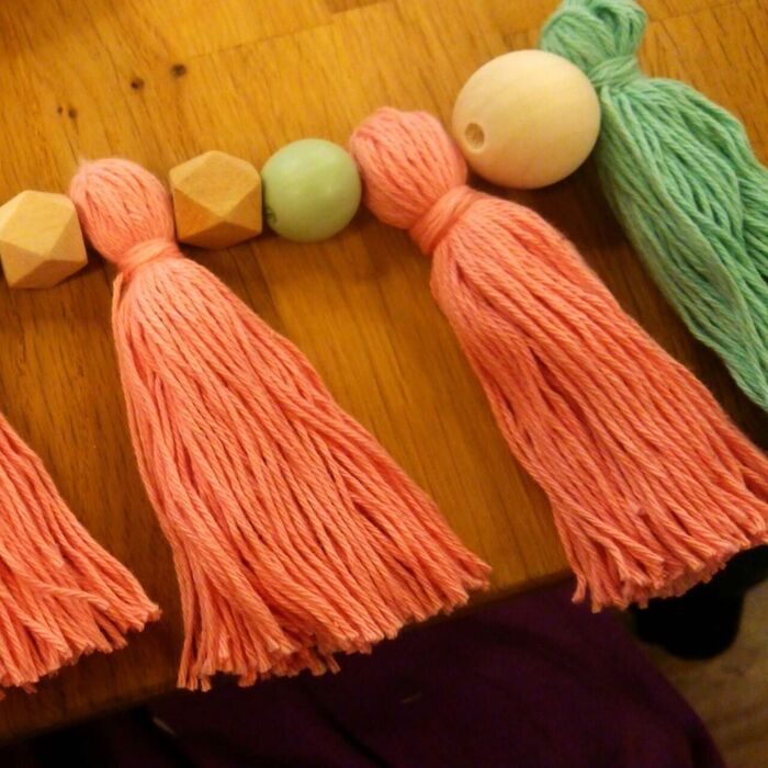 バランスを見てウッドビーズとタッセルを通してガーランドを作ります。
