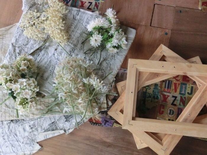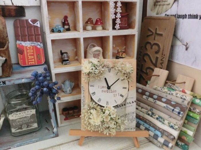 フレームはナチュラル色、フェイクフラワーも同系色を集めました。