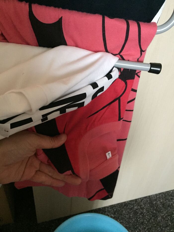 脇の部分を引っ掛けるように、ズボン用のハンガーに掛けます。
