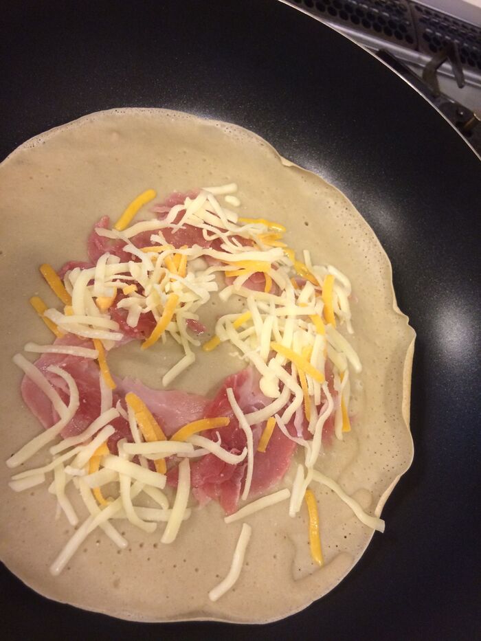 生地の周囲がパリパリしてきたら、中央に生ハムチーズで土手を作るように盛る。