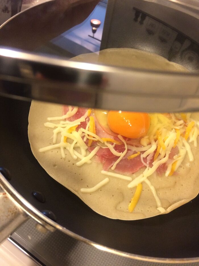 真ん中に卵1個落とし入れ、蓋して、卵が好みの硬さになるまで加熱。