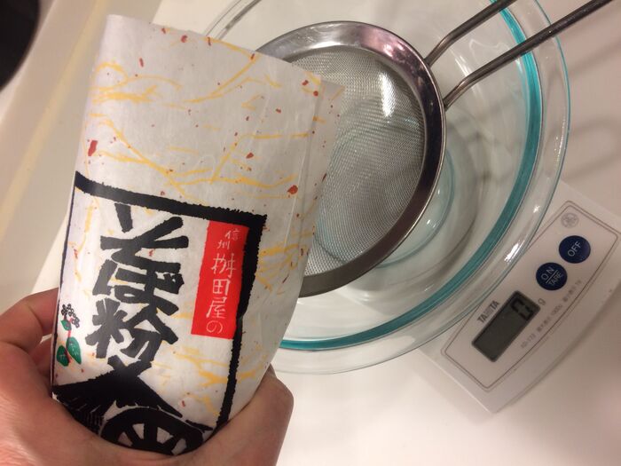 そば粉をふるいにかけ、塩ひとつまみ入れて混ぜ合わせる