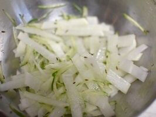 大根は7~8cm幅の短冊切りにし、きゅうりは千切りにし、塩とレモン汁をかけてざっくり混ぜ合わせる。