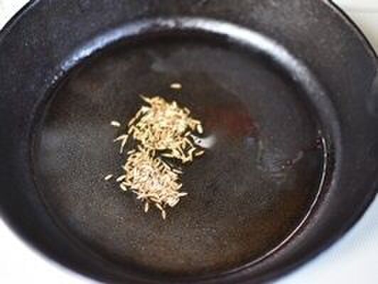 フライパンにオリーブオイル、クミンシードを入れて弱火にかけ、クミンシードのまわりに細かな泡がでてきて良い香りがしてきたら火を止める。