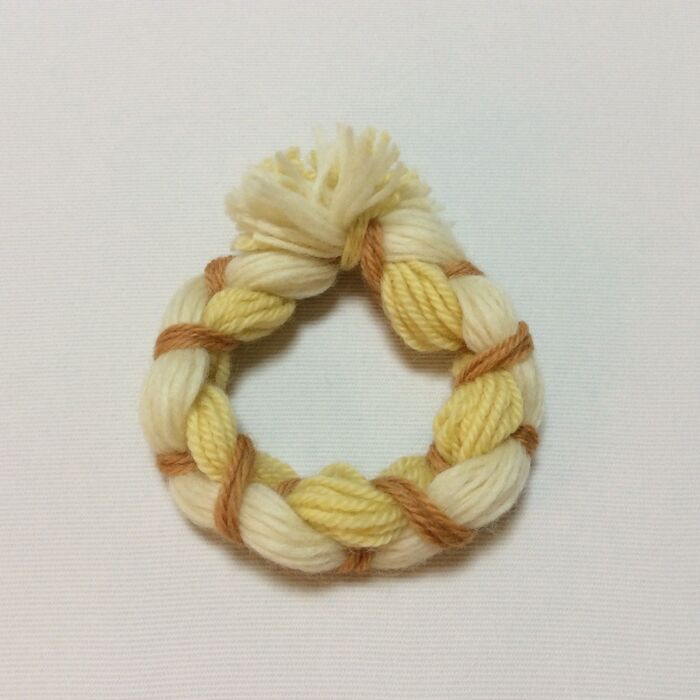 結んだ両端をクロスになるように重ね、また別の毛糸の結びます。