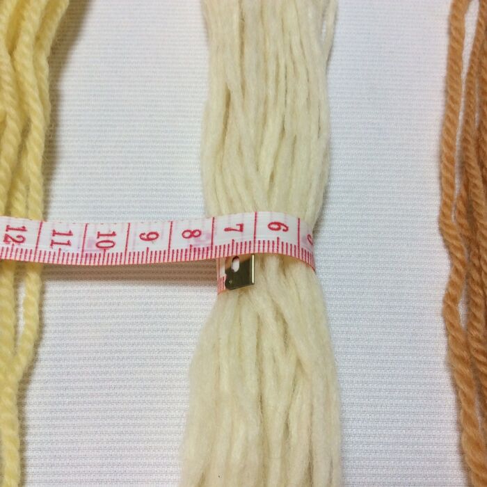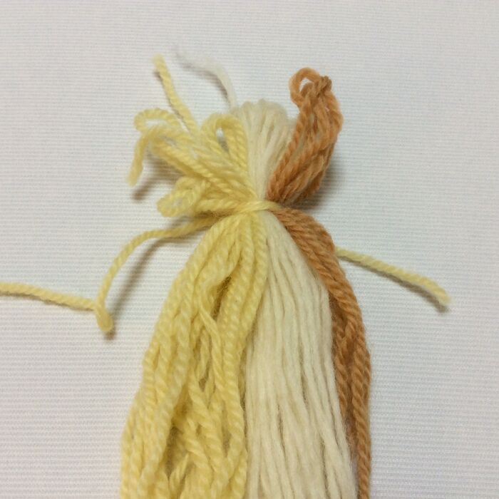 クリーム、ホワイト、ベージュの毛糸をそれぞれ束ねていきます。クリームとホワイトの毛糸は長さ約50cm、ベージュの毛糸は約80cmに揃えます。