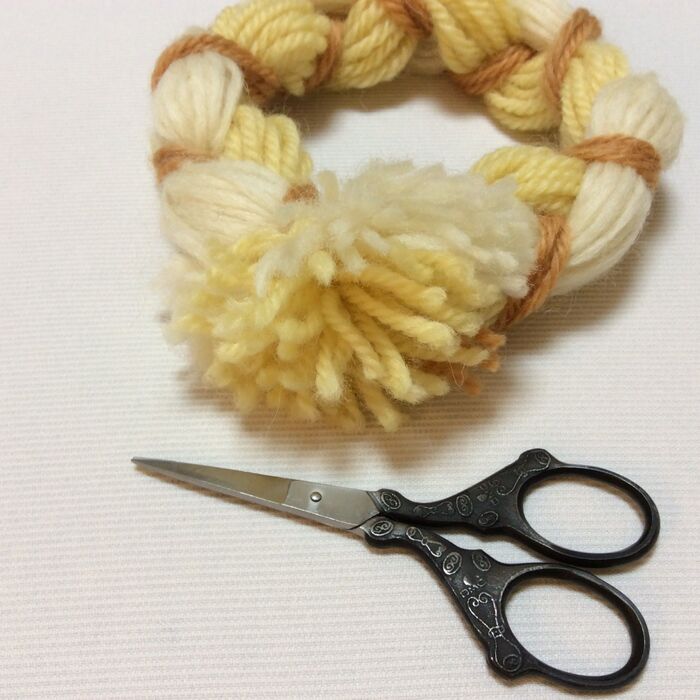 余分な毛糸は、形を整えながら鋏でカットします。ちょうどポンポンを作るような感じです。