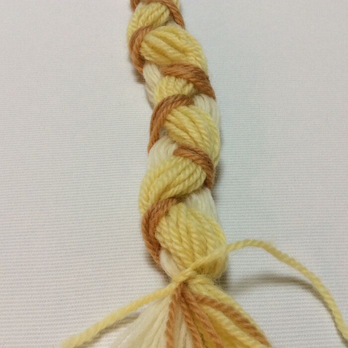 ふんわりと仕上がるように毛糸を三つ編みしていきます。
