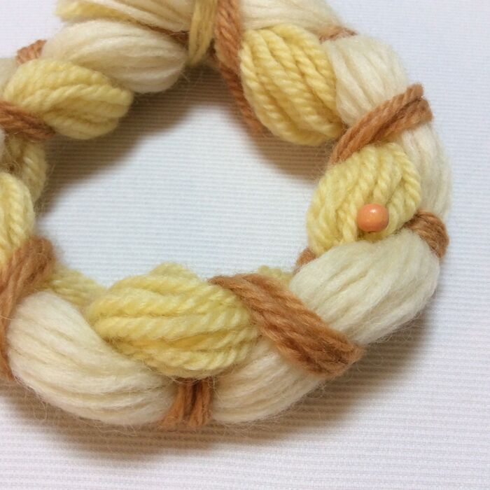 クリーム、ホワイトの毛糸は周囲約6cm、ベージュの毛糸は周囲約1.5cmの太さです。