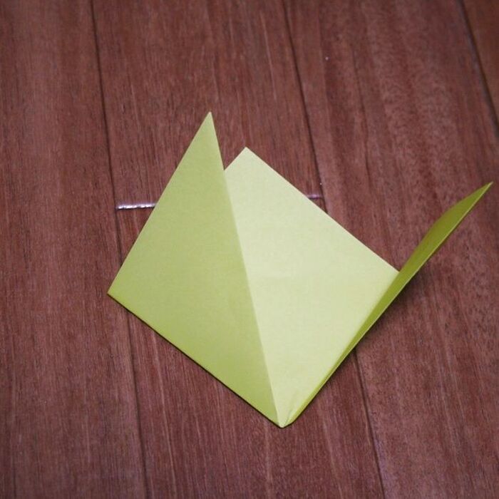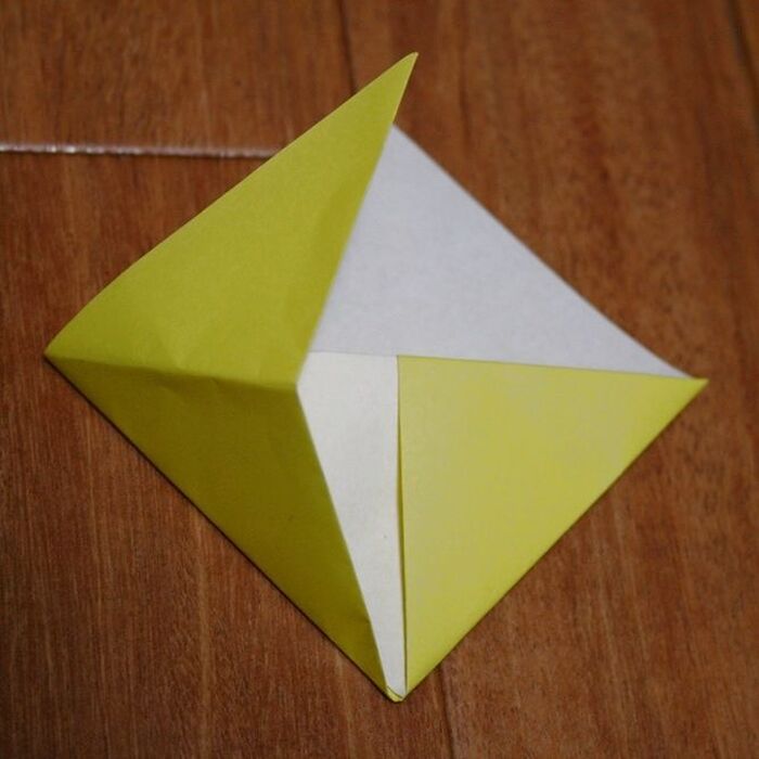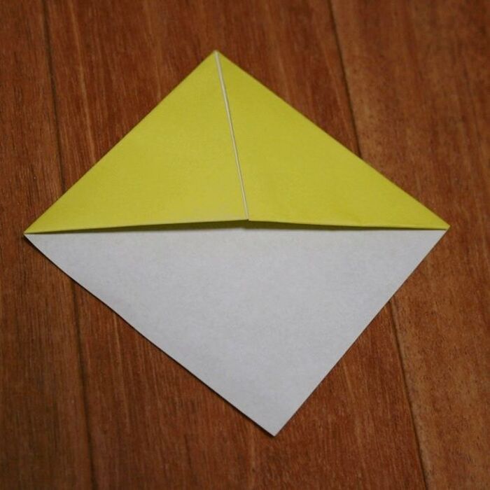 まず 黄色の折り紙を三角に折、こんな感じに両サイドを折り曲げます