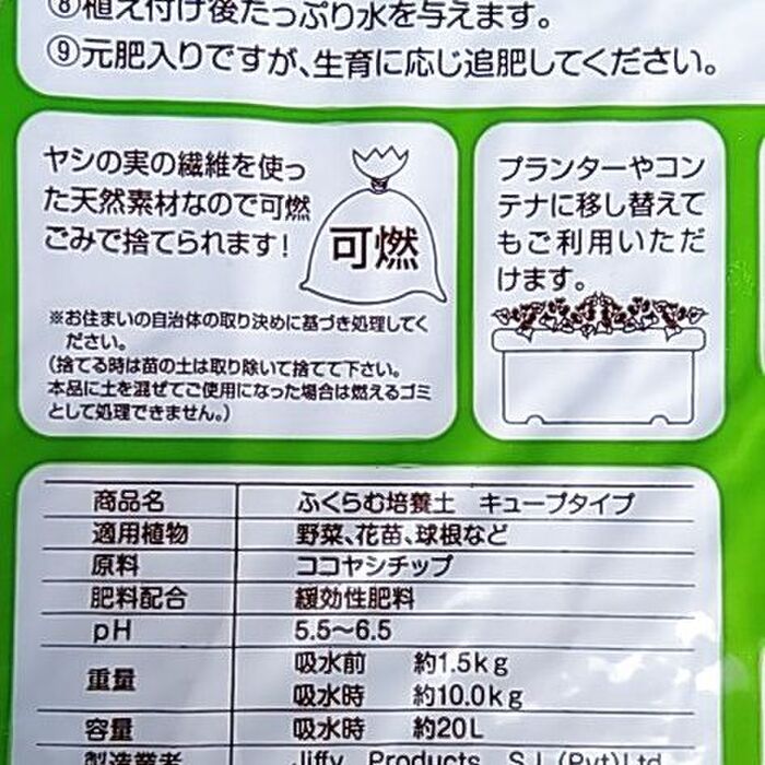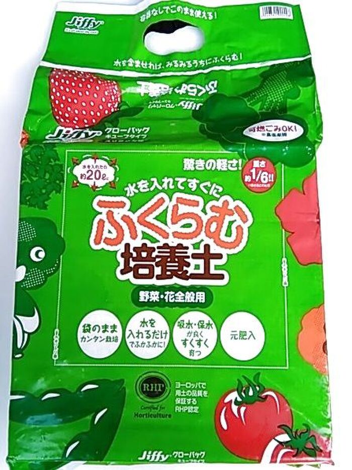 こちらは袋のまま栽培はできず袋から出してプランターに植え替えて使う必要がありますが、水をかけると約6倍にふくらむ元肥入りの約15リットルの土です(^o^)