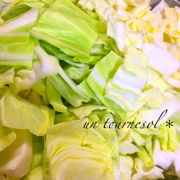 *キャベツの芯はそぎ切りにしておくと、早く柔らかくなります。今回は春キャベツを使用。