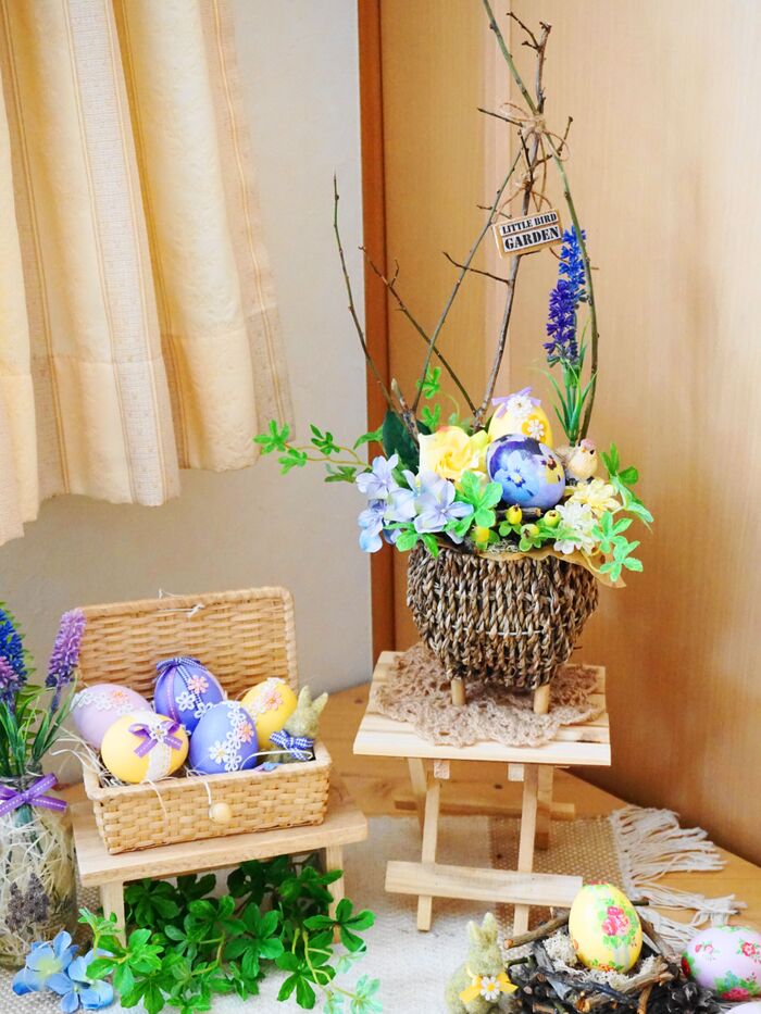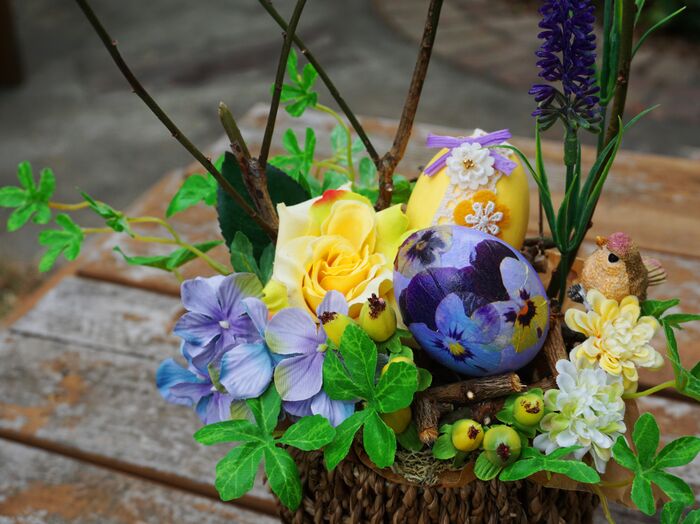こちらはデコパージュしたイースターエッグと一緒にフラワーアレンジメントに。