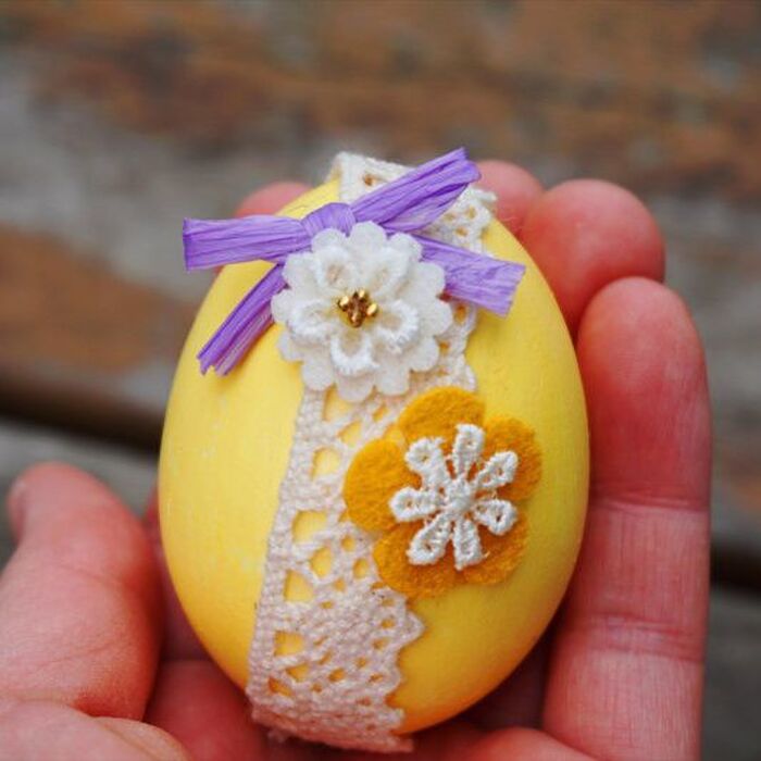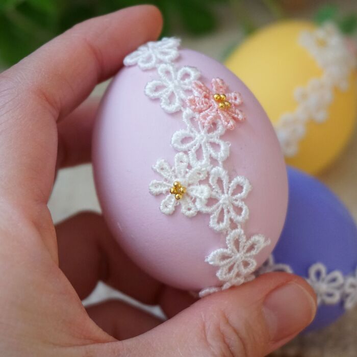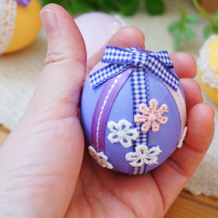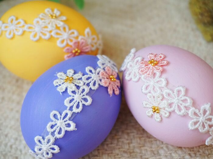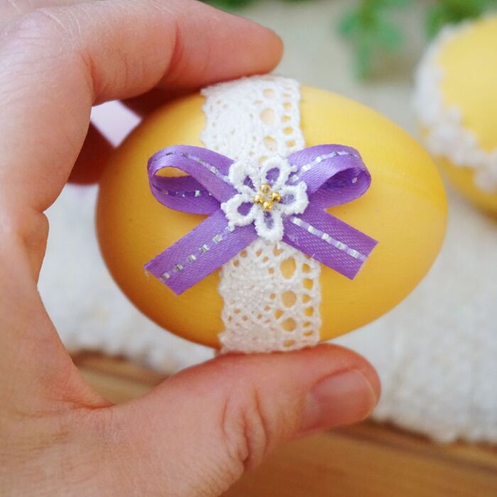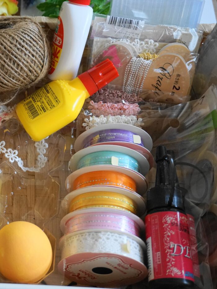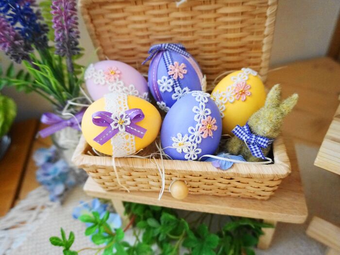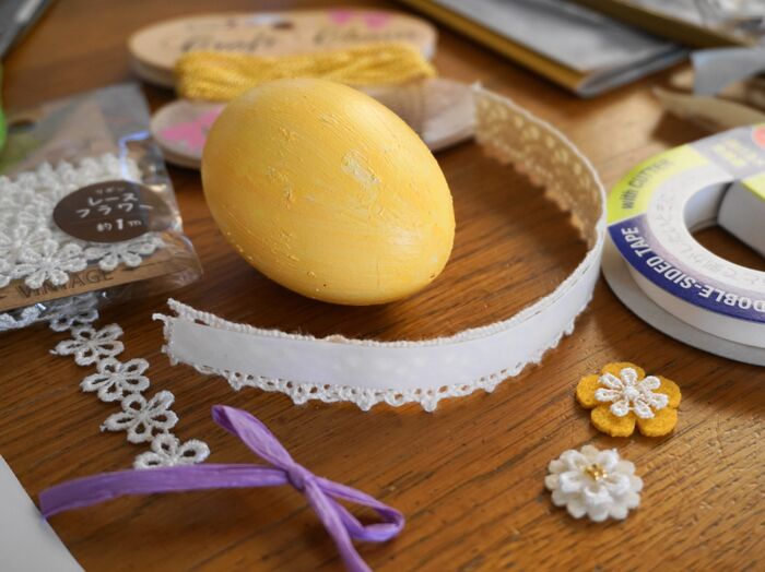 卵の殻は割れるので力を入れ過ぎないようにしてください。ラインで貼るものは両面テープで。リボンやお花など付けるときにはボンドのほうが貼りやすいので使い分けるといいと思います。