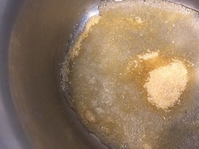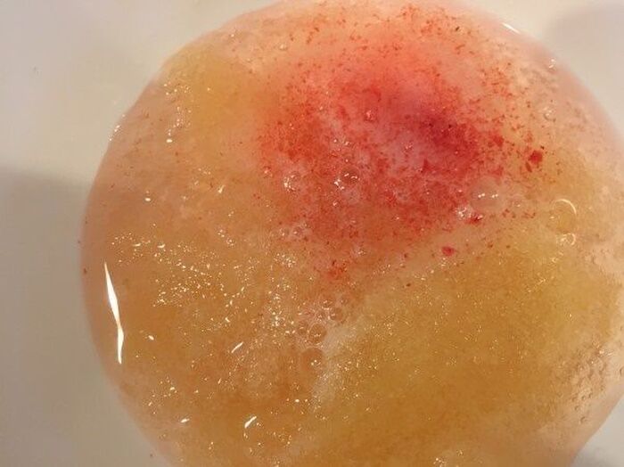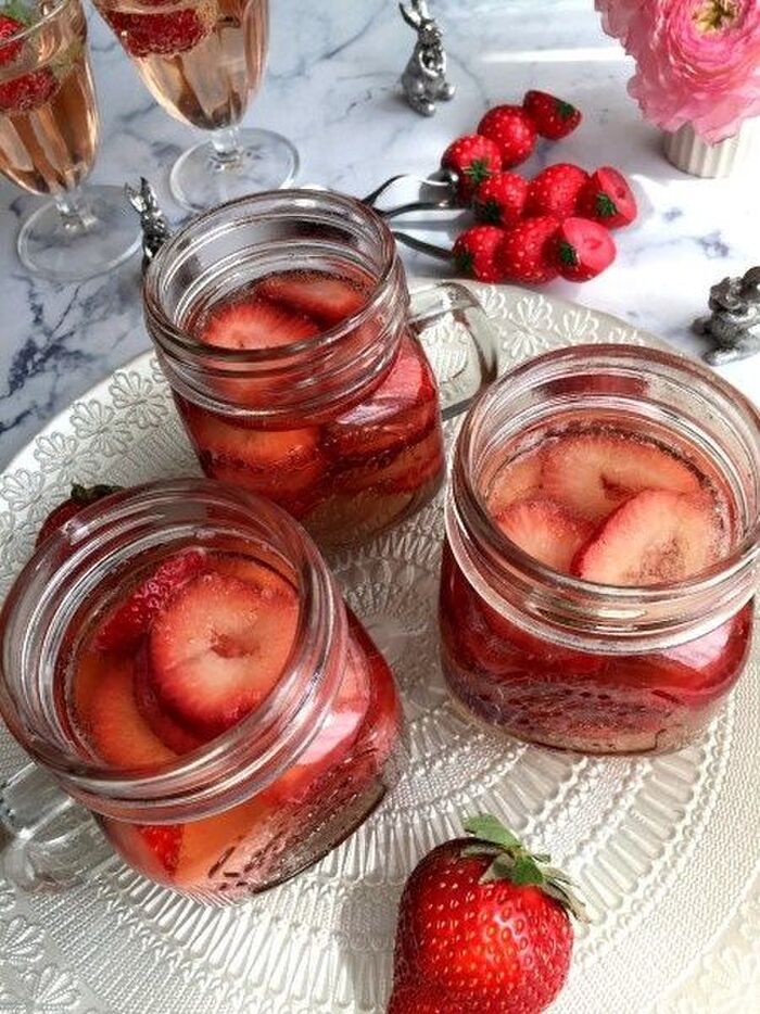 ふやかしたゼラチンに分量のピンクスプマンテ100㏄とグラニュー糖を加えレンジに40秒ぐらいかけ溶かす