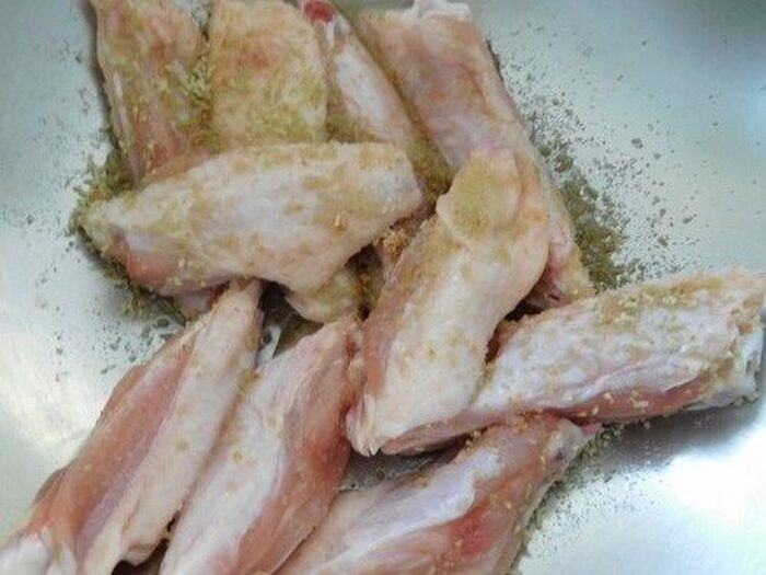 手羽中は早く火が通るように骨を挟んで2本切り込みを入れ こぶ茶と塩 日本酒 サラダオイルをまぶす
