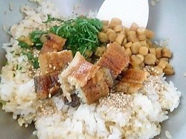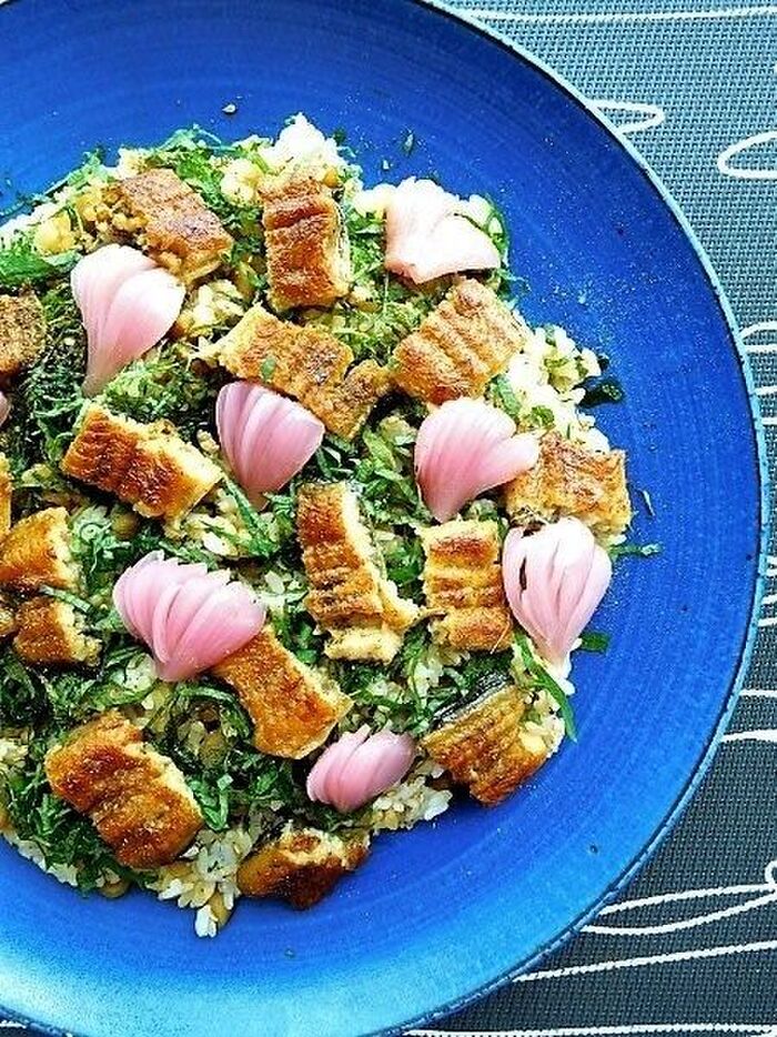 器に盛り付け 残りのしそとうなぎをのせ 残りのタレ1袋を全体にかけ薄切りにしたらっきょうを添えお好みで粉山椒をふる