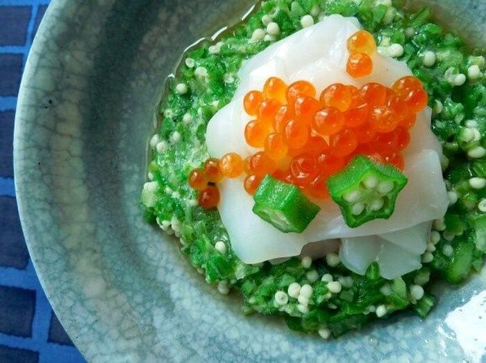 器に叩きオクラをのせイクラと飾りのオクラを添え土佐酢をかける