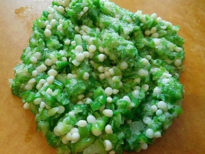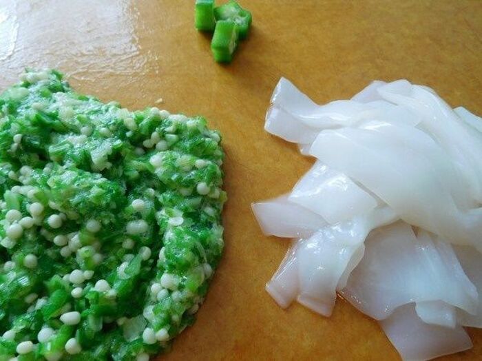 オクラはさっとゆで飾り用に2切れ残しあとは粘りが出るまでたたく