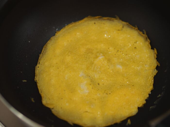 3、2に1の卵液の半分を流し入れ、キレイな円になるように卵液を広げ、両面を焼きます。