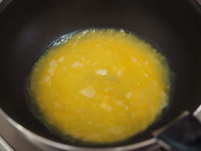 卵液を入れたらすぐにフライパンを上下左右に傾け、卵液を均等の厚さにしましょう。