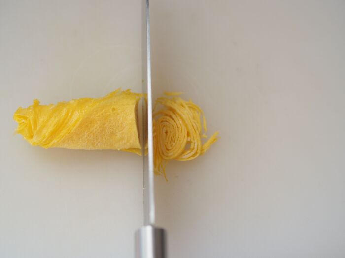 重ねてぐるぐる巻いてから切った「錦糸卵」が出来上がりました!