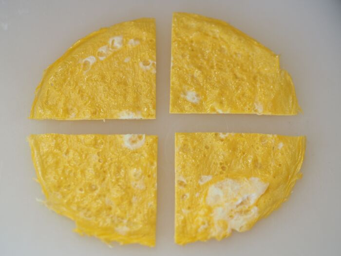 両面が焼けたら取り出し、残りの卵液も同じように焼いて薄焼き卵を作ります。