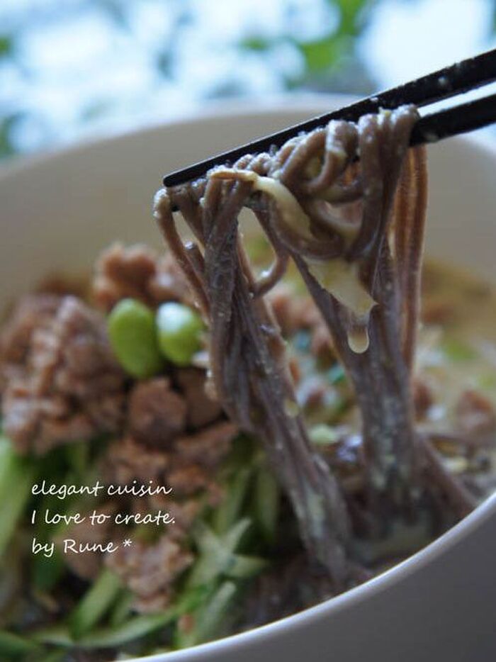 お好きな麺にかけ、もやしのナムル、きゅうりの千切りをかけて茹でた枝豆を載せれば完成です。