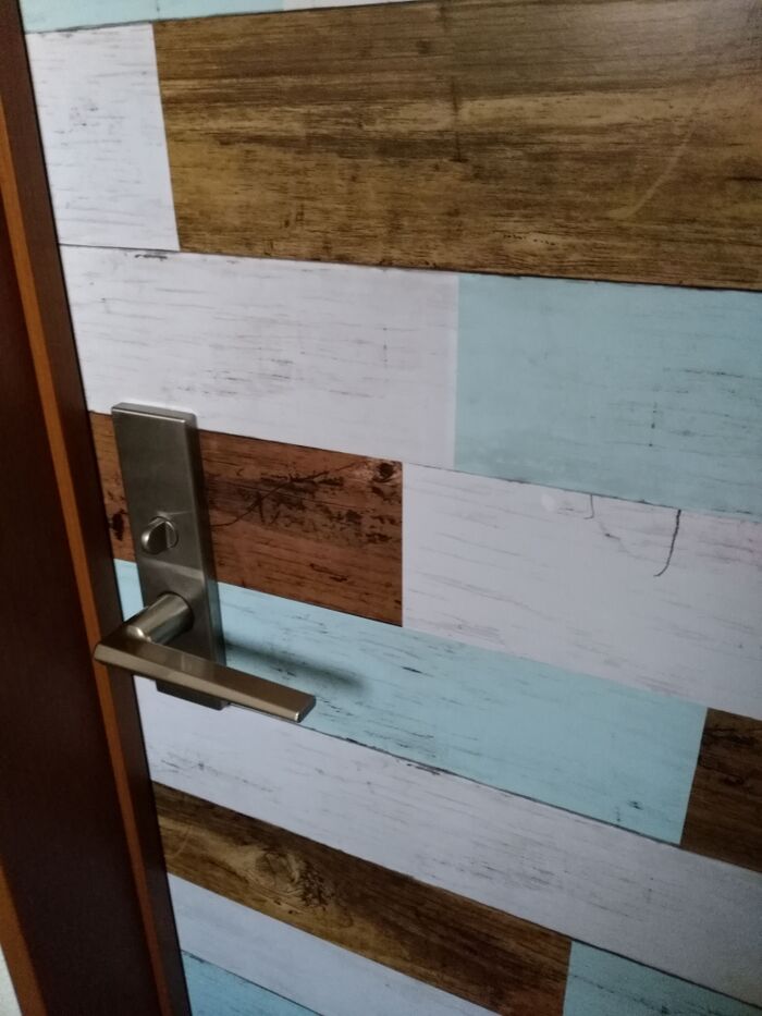 ドアの雰囲気に合わせて、100均すのこを使ってスクラップウッド風にリメイク♡