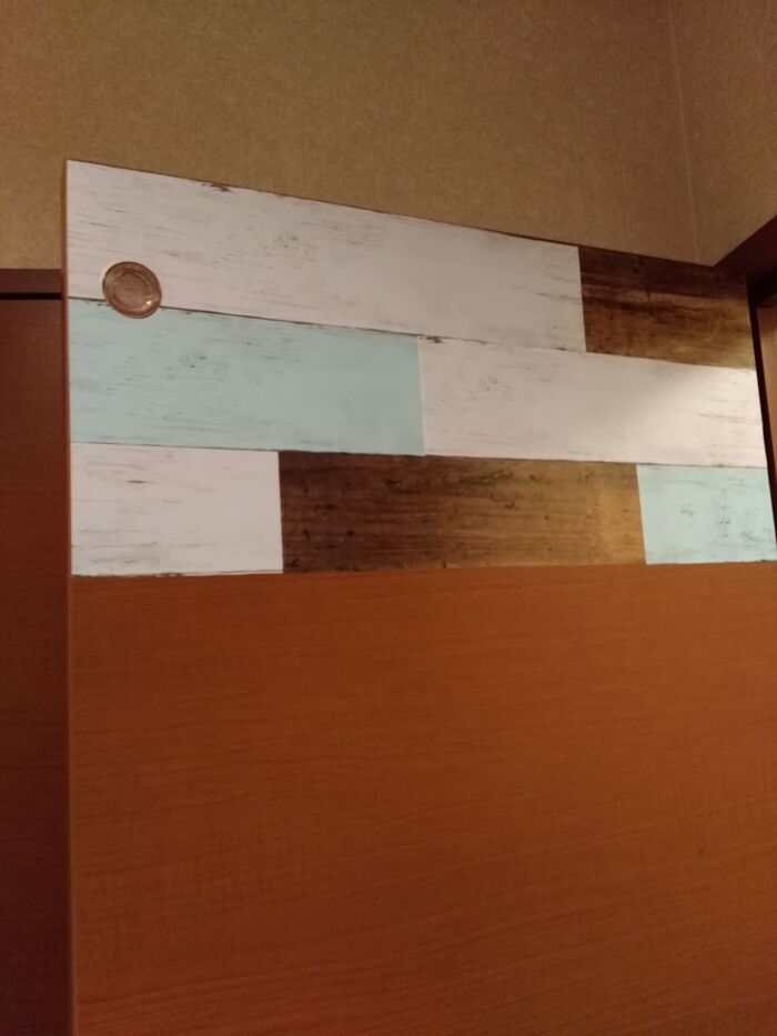 板壁風のブラウン、ブルー、ホワイトの三色を使ってスクラップウッド風に♡