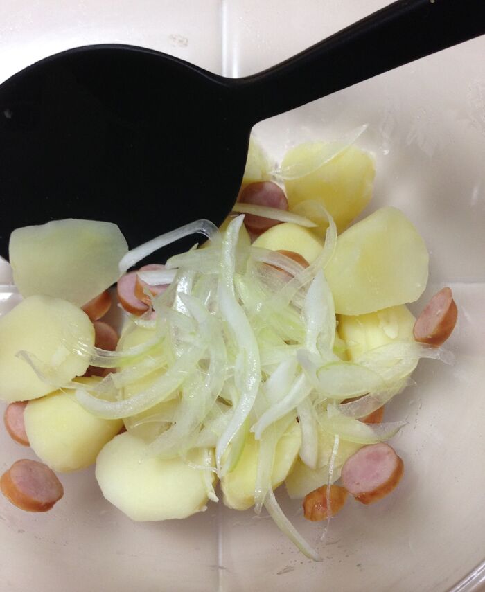 ①玉ネギは、薄切りにし水にさらして、水気を切ります。ウィンナーは、5mm厚さくらいの輪切りか斜め切りにし、熱湯で1分半~2分くらい茹で水気を切ります。