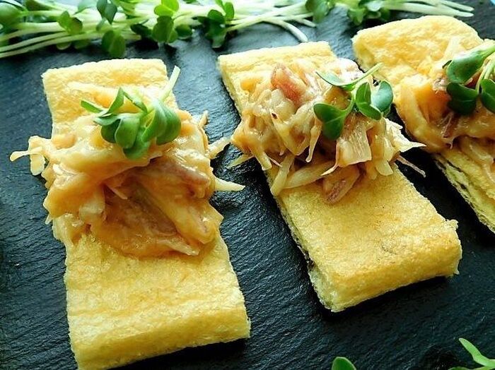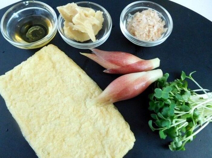 トースターでカリッと焼いた油揚げを4つに切りみょうが味噌をのせカイワレを添える