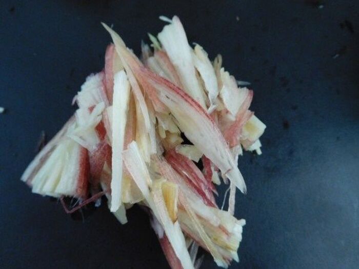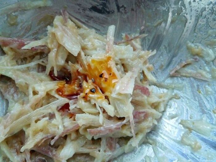 みょうがをみそにいれ 混ぜ合わせラー油をたらす