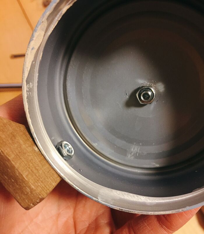 缶に、キリで穴をあけ、ボルトとナットでスパム缶とツナ缶をひとつ繋げました。