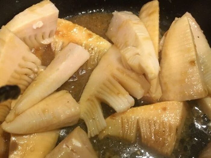 鍋にごま油を入れ中火でたけのこを炒め混ぜ合わせた調味料を加える