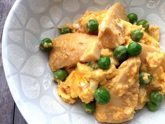 溶いた卵とグリンピースを入れさっと絡めて器に盛り付ける