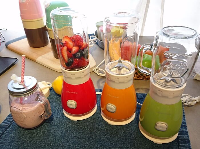 このソロブレンダーソランはガラスジャーごと作れるので、作ったあとにそのまま飲めちゃうのが楽チン♪置いておくだけでもお洒落に見えるのがいいですね。