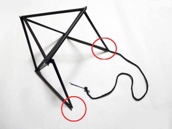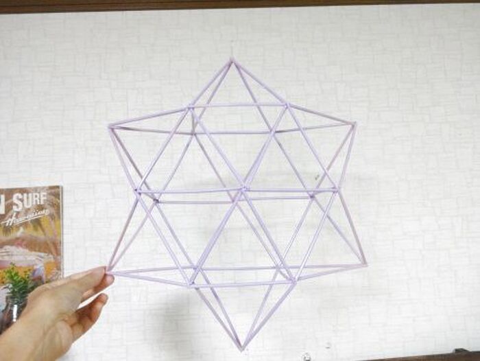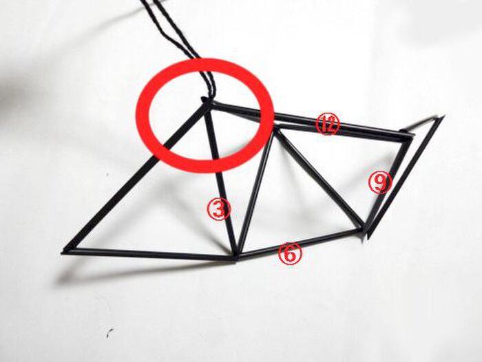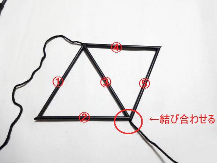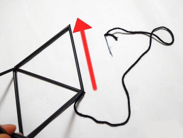 ストローの中に糸を通し、写真のように3角形に組んでいきます