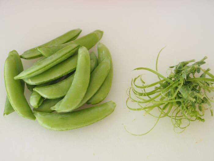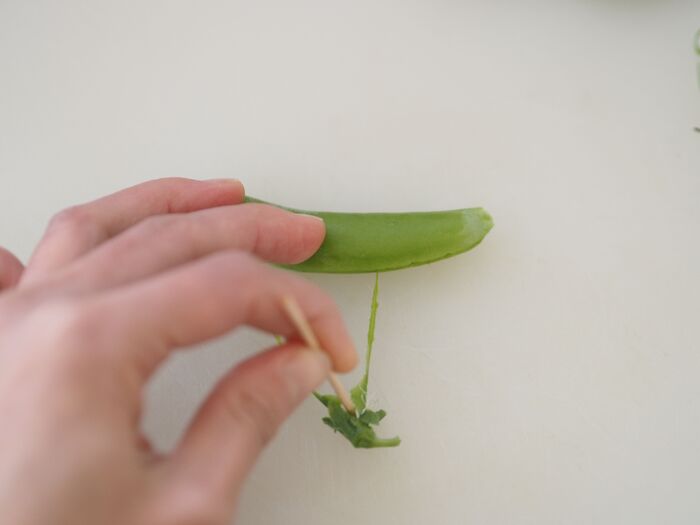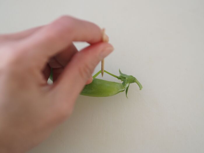 爪楊枝を刺す位置は、気持ち少しだけ上側だと取りやすいですよ。あと、スナップエンドウの美味しい食感を残すために、くれぐれも茹で過ぎないように気を付けて下さい!