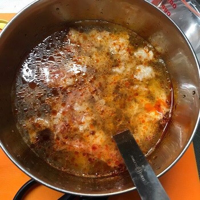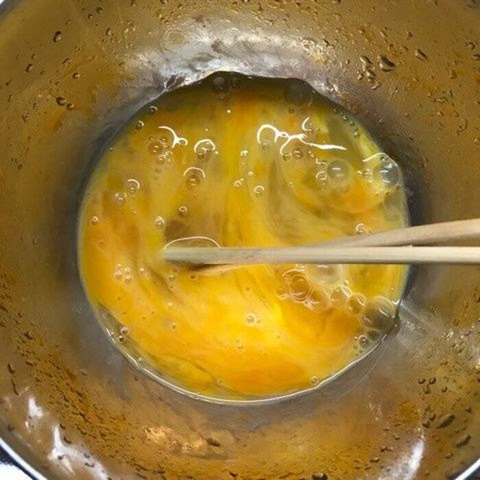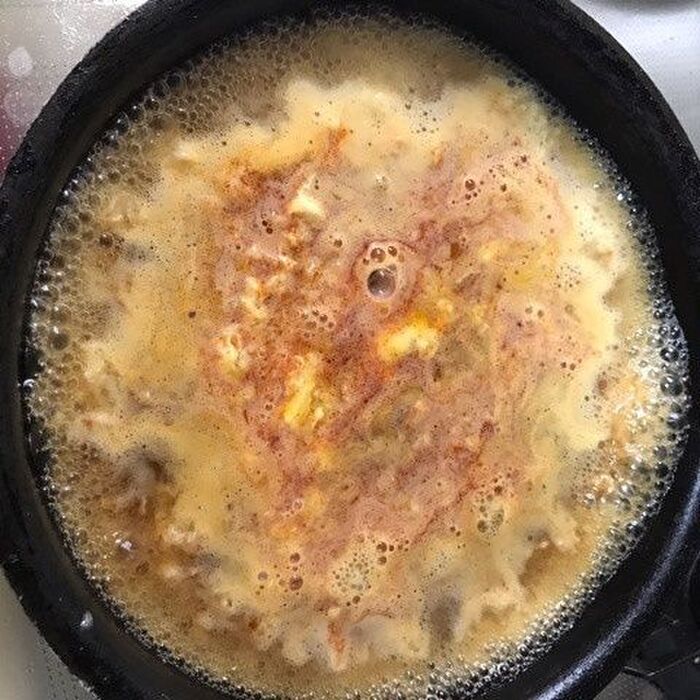 ⑤フライパンに③を入れて煮立たせ、ここで蟹が大きいようならお好みに崩しておきます。④の卵を入れてしばらくおいて全体に混ぜます。良い具合に卵がなったら、④の水溶き片栗粉を入れてとろみをつけます。