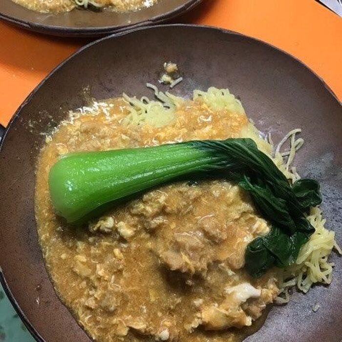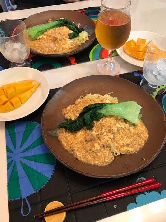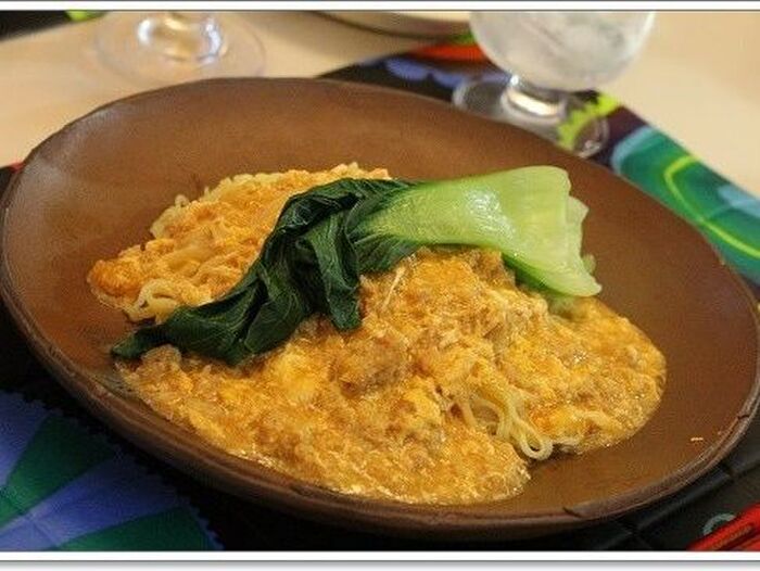 たまごと蟹のあんがとろっと麺に絡まって、酸辣湯風のかに玉のまぜそばの出来上がりです♪スープの美味しさをそのまま生かして、味付けはしていません。上にのせた青梗菜もシャキっととっても美味しいです♪