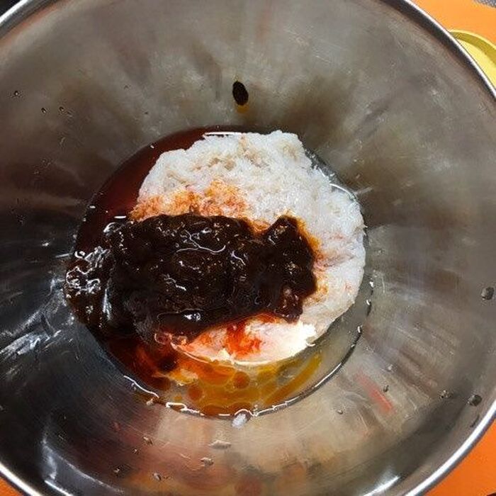 ③ボウルに、蟹缶(汁ごと)と付属のたれ、水を入れて全体にまぜておきます。