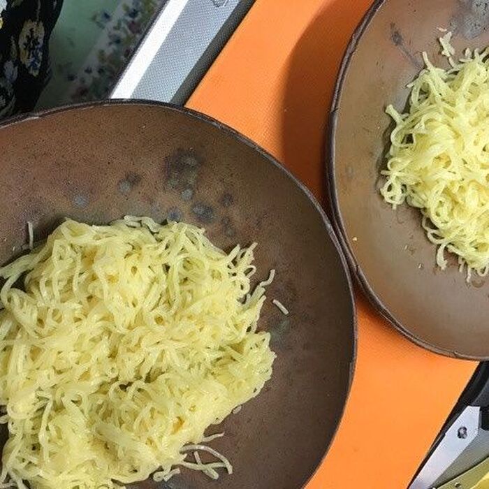 ②日清ラ王 酸辣湯麺を袋の表示通りに茹でます。茹でたら、ザルにあげて水気を切り、ボウルに入れ、ごま油小2を全体に入れて混ぜておきます。(味付けとくっつき防止のため)