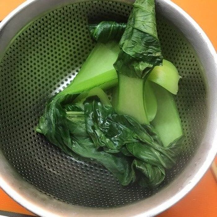 ①青梗菜を1枚ずつ根元からちぎり、塩を入れた熱湯で茹でて、ザルにあげて水気を切って冷ましておきます。