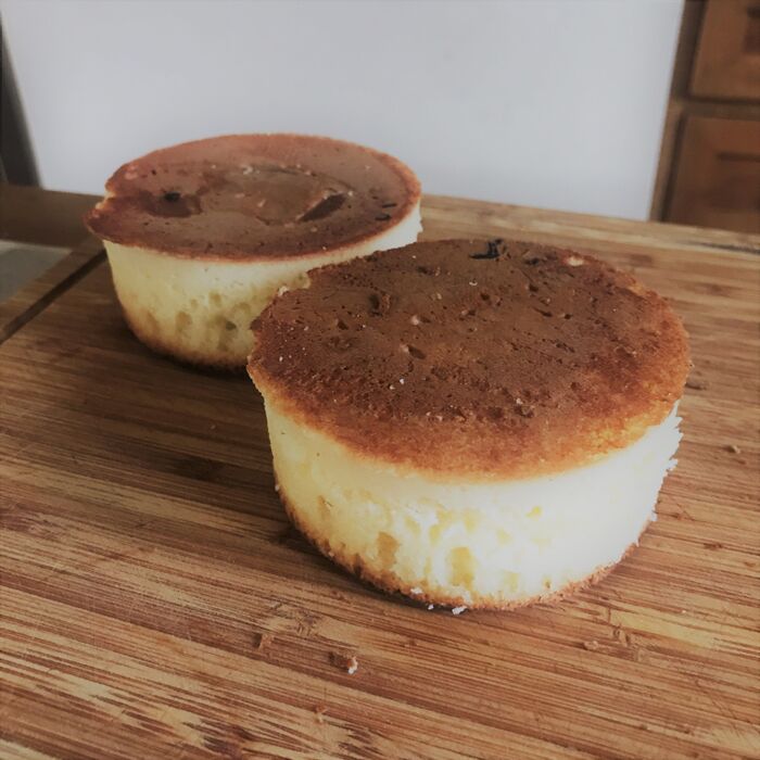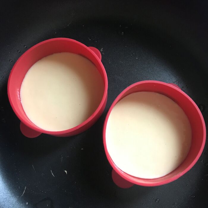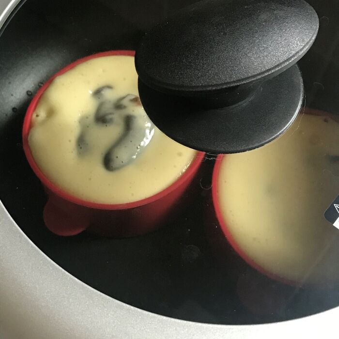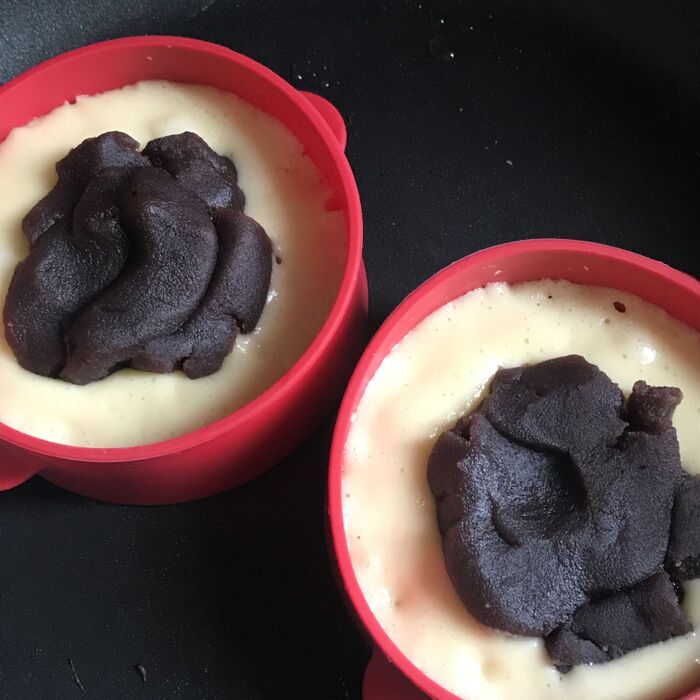 中心にあんこをいれて、また生地を追加で足します。型の8割の高さになるように。また蓋をして待ちます。