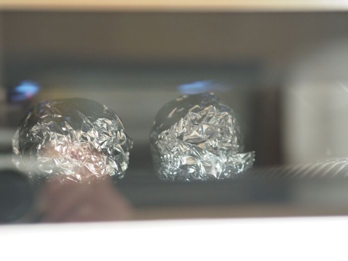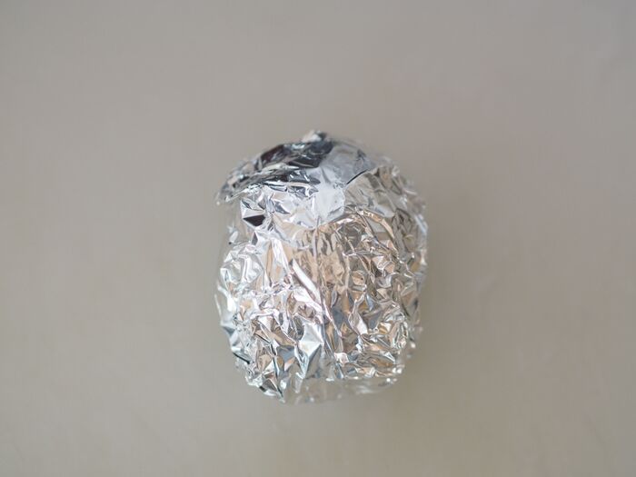 2、1の卵をペーパータオルを巻いたままアルミホイルで包みます。